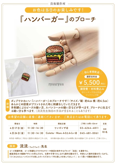 2F【貴和製作所】刺繍講習会のお知らせ(4/17・24 開催)