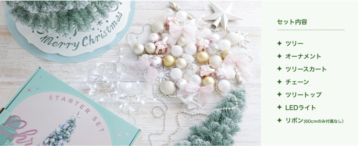 クリスマスツリーの色と大きさに合わせたオーナメントや照明が1パッケージに。