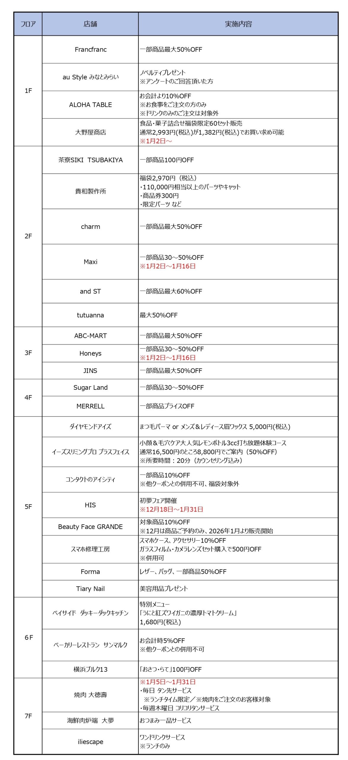 冬を楽しもう!Colette Mare Winter Bargain 開催 2025.12.26 Tweet ★Colette Mare Winter Bargain スタート!★ 12月26日(金)~1月31日(土)まで、ウィンターバーゲンを開催します! 各店舗限定のおトクな商品やサービスが盛りだくさん! 冬のお買い物はコレットマーレがおトク! 【開催日時】 12月26日(金)~1月31日(土) 【対象店舗一覧】