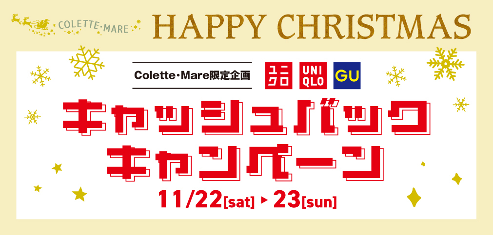 11月22日(土)~11月23日(日)の2日間、”ユニクロ・GUキャッシュバックキャンペーン”を開催いたします! 各日先着でコレットマーレでご利用いただける500円分のお買物・ご...
